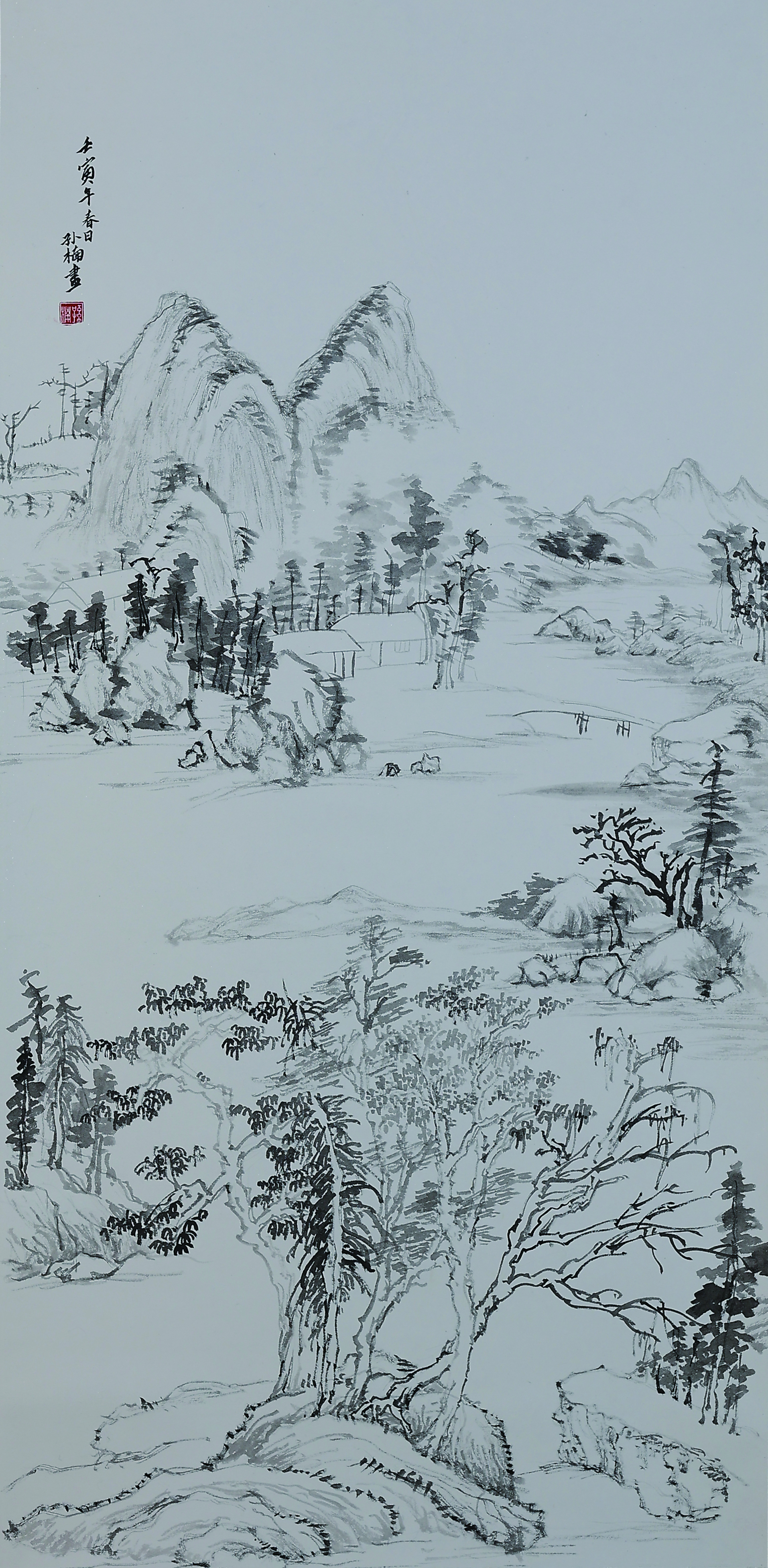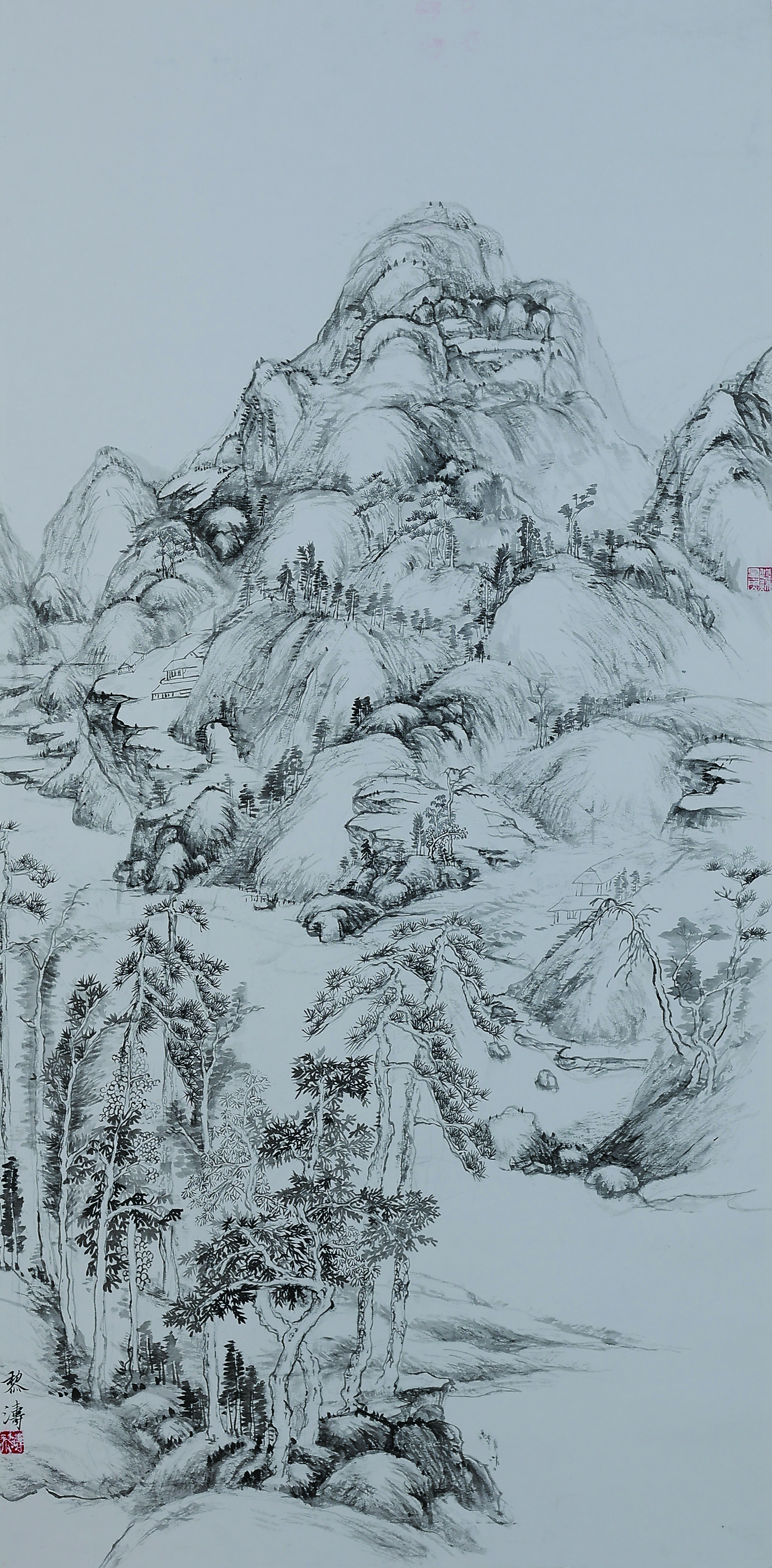 The peaks in the painting are all made and chapped by Peima Cun. Several trees and highly postured stones in the close-up and mid-range show the space in the painting, and the houses and characters increase the level changes of the painting. That’s why the work is named Dwelling in the Mountains.