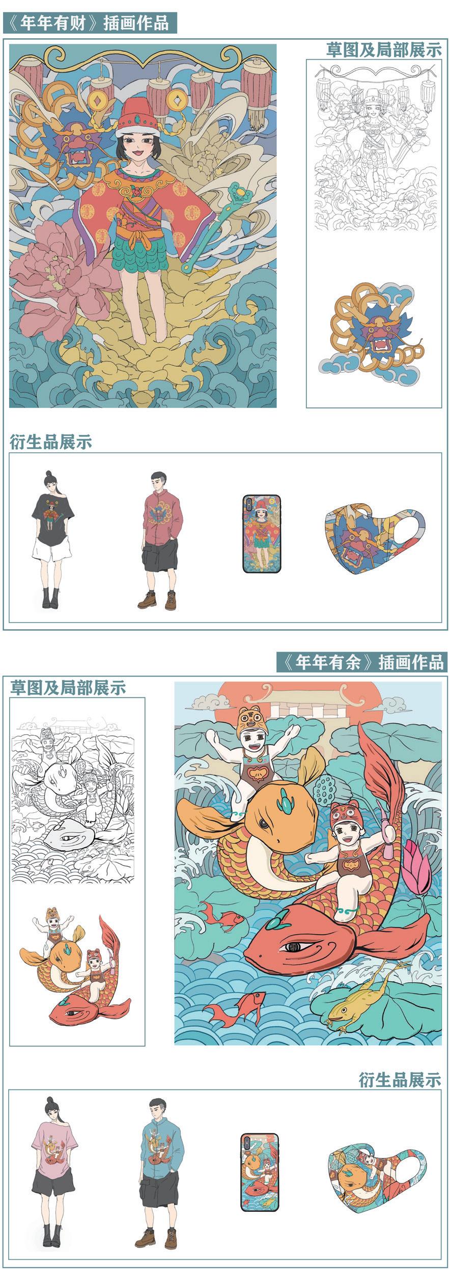The design is mainly based on the Shandong color printed fabric design innovation as the starting point of exploration, analysis of the unique artistic characteristics of color printed fabric design, summarize the pattern features. He pattern design is mainly created by extracting and summarizing auspicious elements from the color printed fabric. The implied meanings of the six basic drawings respectively represent the good wishes of realizing ideal, family prosperity, longevity and health, auspicious wealth, god-given marriage and good luck. The implication of the pattern in the color printed fabric gives the new connotation of The Times on the applied cultural and creative products.