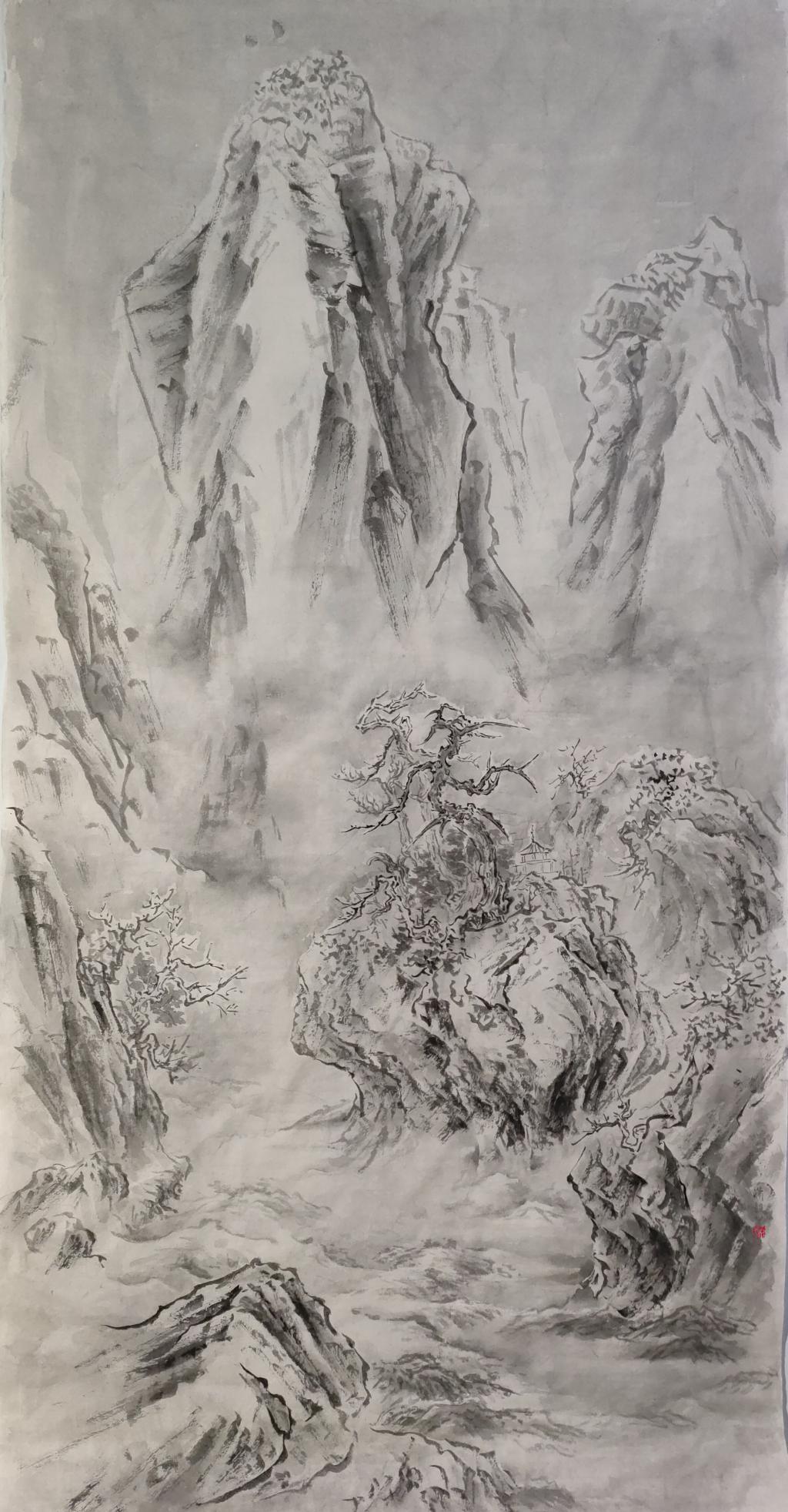 In the creation, the skeleton is constructed with line first, then the light and shade and texture is enriched with ink, and finally the color is applied according to the needs of the picture. What landscape painting pursues in modeling is the combination of objective description of concrete objects and subjective "abstract" meaning, so that the form, spirit and meaning of the picture can achieve harmony and unity.