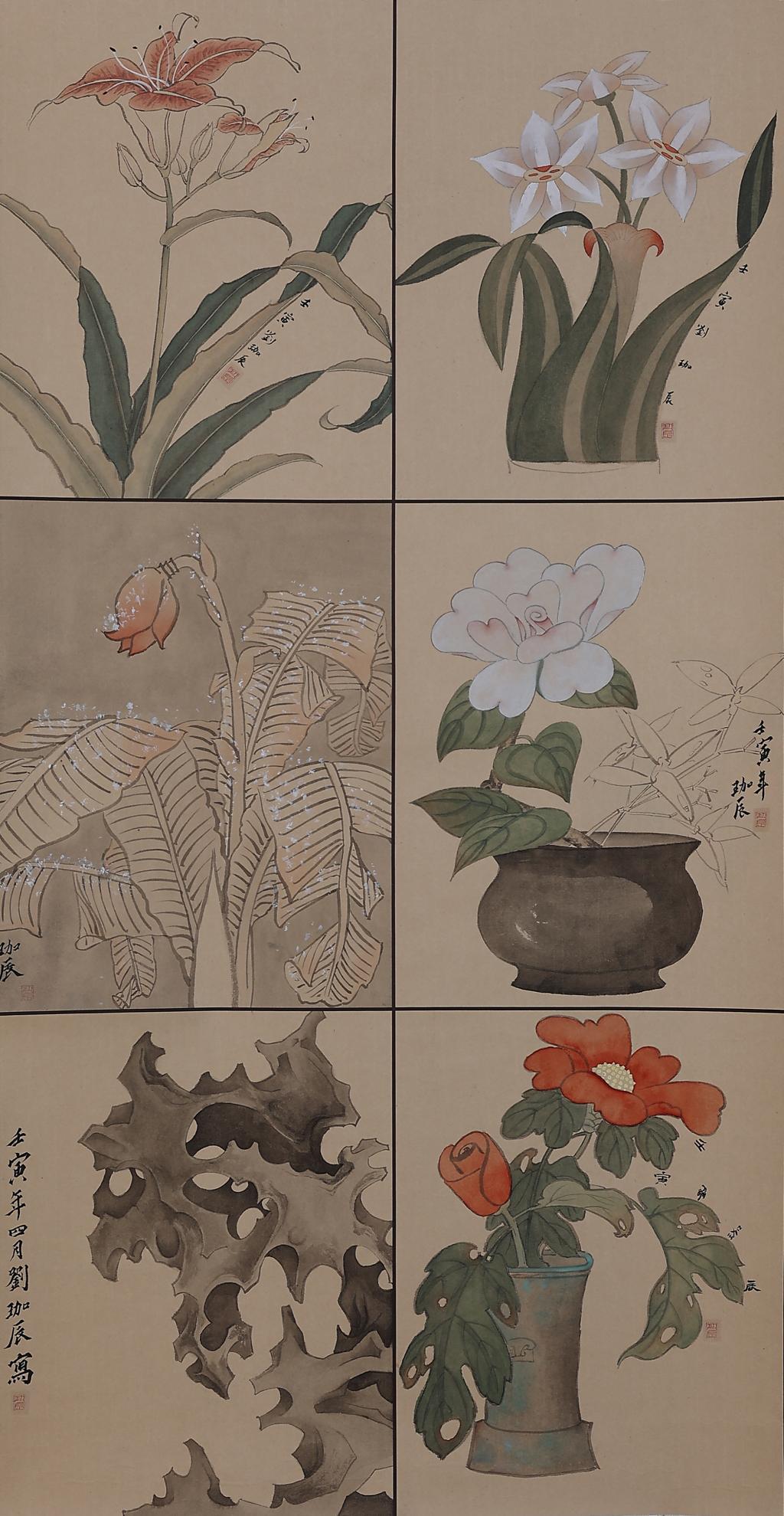 仿元人山水笔意,整幅为 6 块小品。作品采用传统披麻皴的笔法,间用水色,先皴后染,用墨色分山石结构、青色和浅绛丰富肌理,意在古朴稚拙中表现晕染变化之能势,在意境清幽中营造秀美灵动之神。