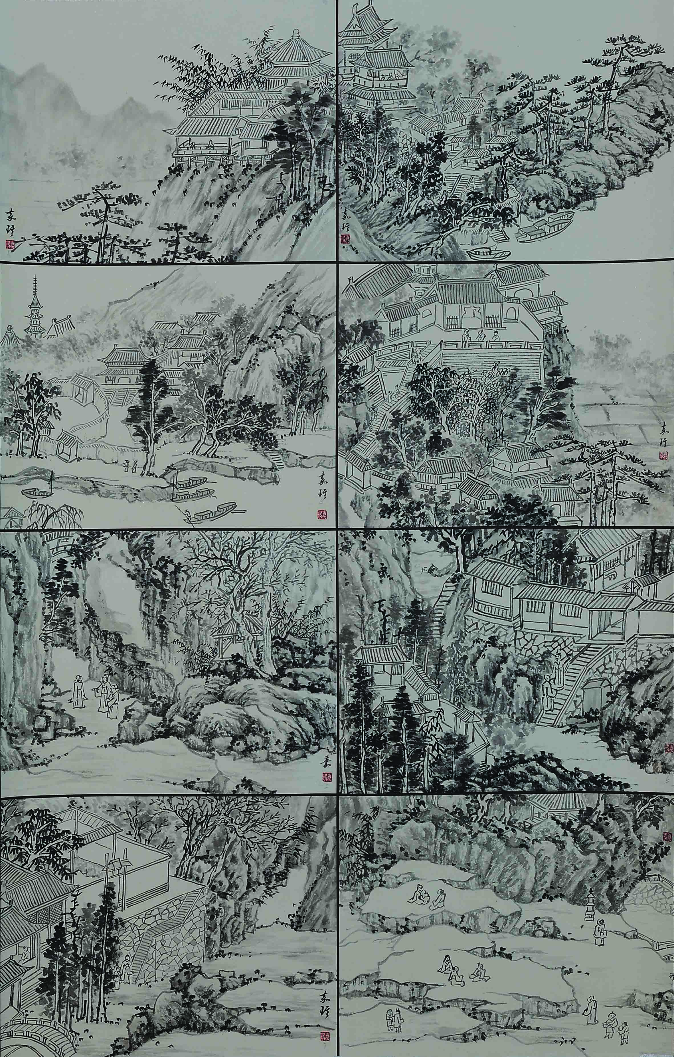 The whole piece imitates the way of landscape painting in the works of the Yuan dynasty and consists of six small paintings. The work uses the traditional brushwork of Peima Cun, interspersed with water colours.It is first chapped and then dyed, using ink to divide the structure of the rocks and green to enrich the texture. It is intended to express the dynamic sense of haloing and change in the simple and naïve bushworks, and to create a soul of beauty and spirituality in the quietness of the mood.