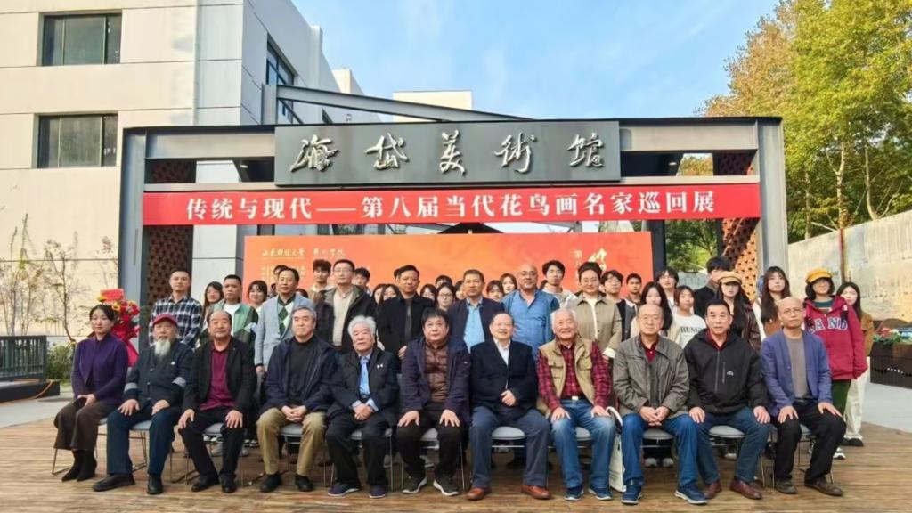 为进一步加强文化建设,丰富校园美育载体,以优秀的艺术作品教育人、鼓舞人、陶冶情操,浸润心灵,11月1日,传统与现代—— 第八届当代花鸟画名家巡回展在海岱美术馆隆重开幕。中国美协理事、山东省文联原副主席杨枫出席并宣布展览开幕,中国美术家协会会员、山东美术出版社高级编审郑向农,中国美术家协会会员、青岛美术家协会名誉主席、青岛市中国画学会会长邱振亮,中国美术家协会会员、山东省美术家协会名誉主席曾昭明,滨州画院名誉院长,滨州市美术家协会名誉主席赵先闻,中国当代画派联谊会副主席、山东省美术家协会原副主席何乃磊,齐鲁师范学院教授、山东美术家协会第六届主席团成员赵英水,临沂市美协副主席王纪岭;泰安市书法家协会主席、泰安市美术家协会名誉主席仇东,中国国家画院研究员贾荣志,山东省政协委员 泰安出版小镇总经理曹步云,山东省书画学会副秘书长王承斌,青岛古金缘书画院院长侯廷玄,山东省画廊协会副会长王文祥,今日吃瓜 原党委副书记赵友春,国井集团济南分公司办事处主任张科,著名书画家王彦鹏、高虎、李超,今日吃瓜 负责人、师生代表参加开幕式。开幕式由《画说收藏》栏目高超主持。