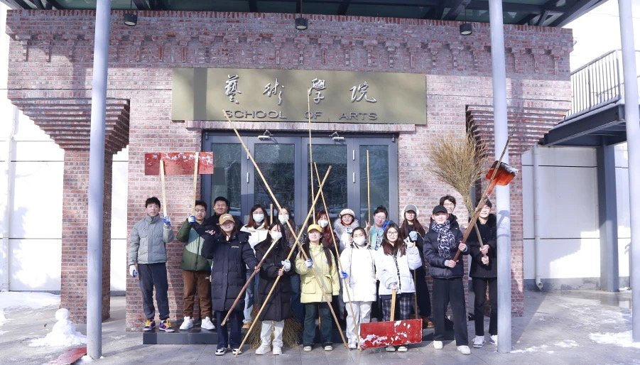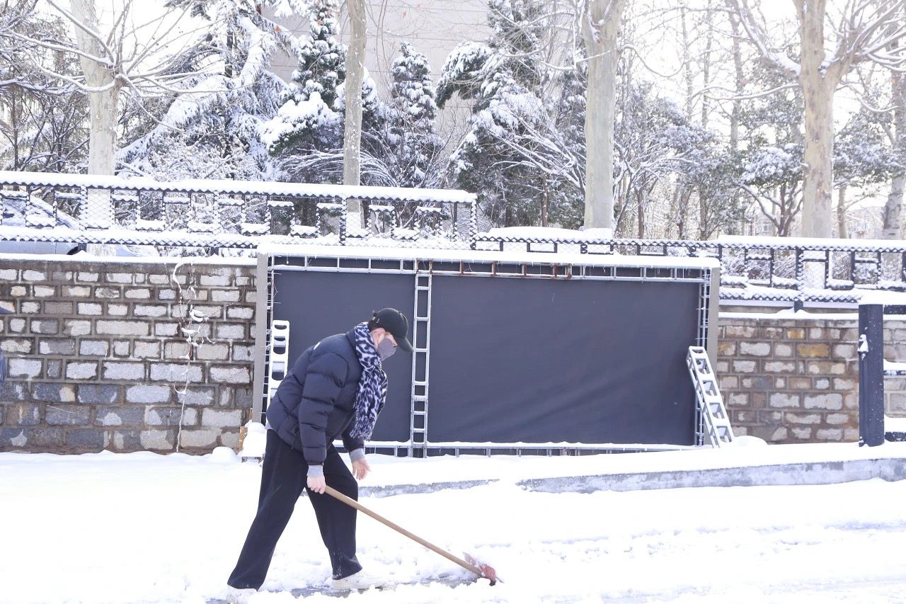 春寒料峭,积雪成冰。早上8点,志愿者们手持雪铲、刮冰刀等工具,迅速投入清扫工作。大家分工协作,有的奋力铲除主干道坚冰,有的细心清理台阶暗冰,有的转运积雪至绿化带……经过奋战,学院主要通道、美术馆前广场及停车场等区域被清理得干净畅通,为师生开辟出"安全路"。下午5点,继续组织志愿者开展校园公共区域积雪清扫工作,保障师生安全出行。